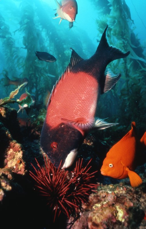 This weeks foray into the kelp forest presents us with one of the most versatile and important residents of California’s nearshore waters, the Sheephead. A large member of the wrasse family, this hermaphroditic species feeds mainly on urchins and other shellfish, keeping populations in check and rocky reefs healthy. These guys are considered a fairly vulnerable species to the pressures of recreational fishing with mainly large males being targeted, resulting in an imbalance in the populations male-to-female ratio when it’s time to reproduce. Next time you’re out there and you come across a large urchin barren, such as the ones you find off Palos Verdes, look around for Sheephead. Then look some more. You probably won’t find many. Healthy Sheephead populations mean healthier reefs and kelp forests. The more you know.