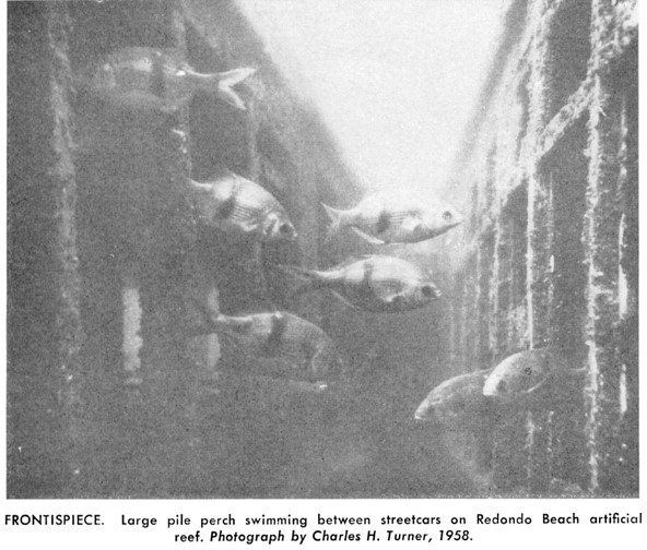 An early attempt in the science of creating artificial reefs for Throwback Thursday. Here’s a shot from out in Santa Monica Bay from the late 1950’s showing an abundance of Pile Perch on one of the many artificial reefs created by a variety of groups and municipalities out of a variety of materials during the 1950’s.