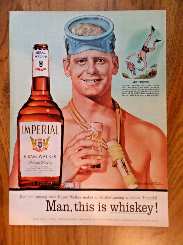 First up is this “man o’ man” ad for Hiram Walker Blended whiskey featuring champion spearo Art Pinder. Not sure what’s better? Blending several different whiskeys to make one smooth pour or mixing high-grain alcohol with a sport where you’re armed with a spring-loaded spear. Pro tip here – Best thing about drinking in your skin diving kit is that throwing up on yourself makes for easy clean up. This is some real “Mad Men” gangster stuff.